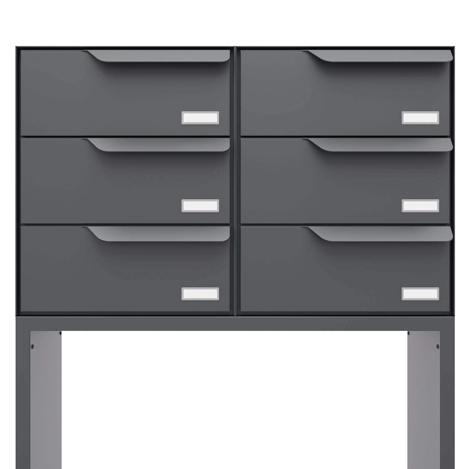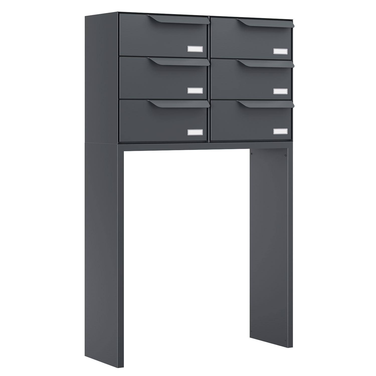 Freistehende Briefkastenanlage für sechs Parteien: Dank der besonders stabilen Standfüße frei platzierbar und auch ohne Erdanker besonders standfest – ein Highlight für jeden Eingangsbereich.