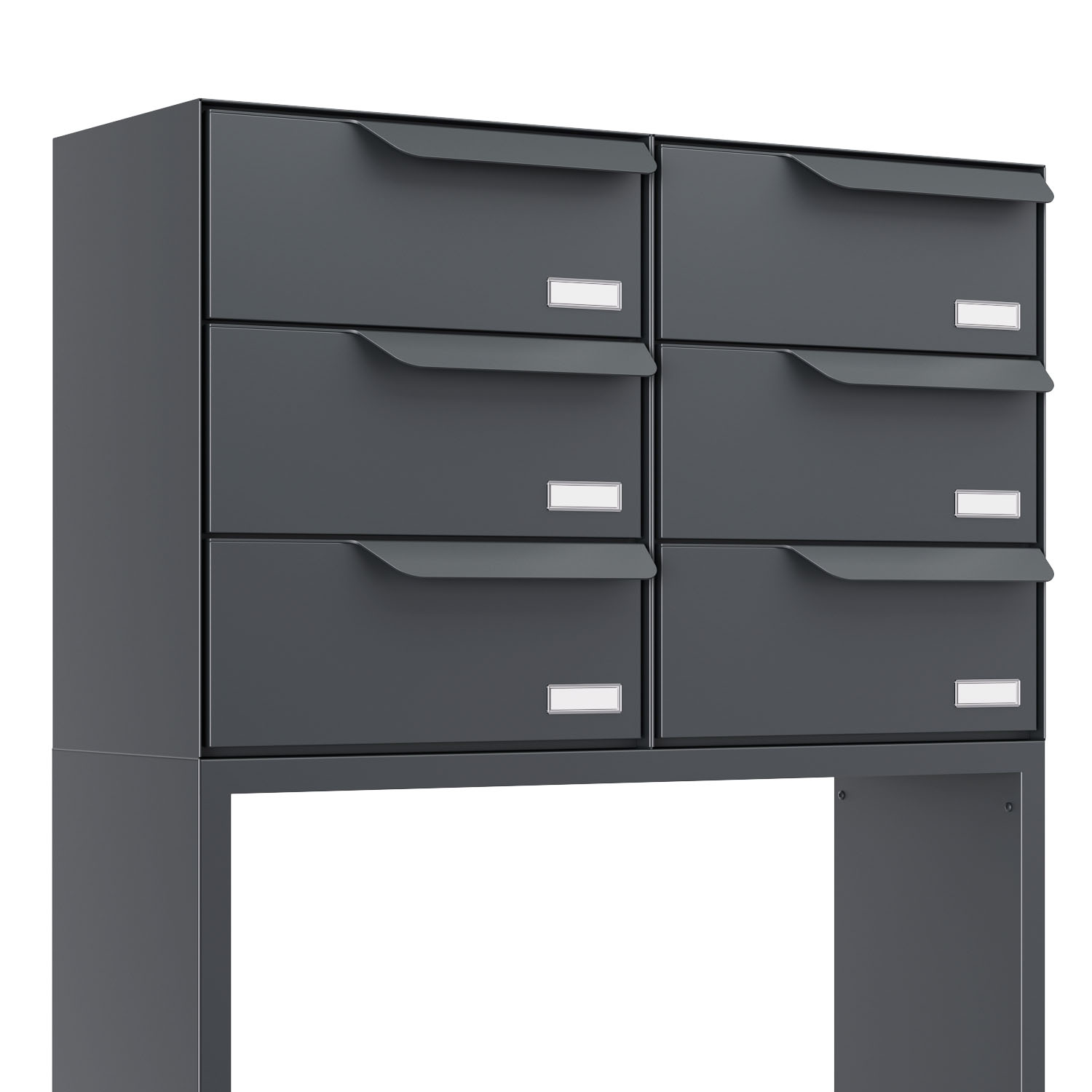 Vertikale 3x2-Anordnung: Sechs separate Briefkästen, in drei Reihen übereinander und jeweils zwei nebeneinander angeordnet, sorgen für eine platzsparende, elegante und funktionale Lösung.