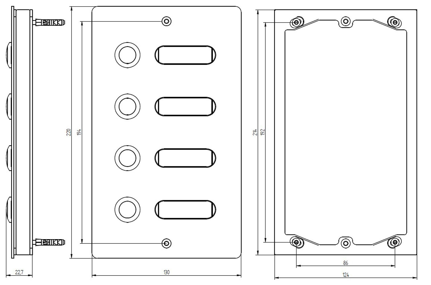 Mit ihren Abmessungen von 130 × 220 × 19 mm und der rechteckigen Form passt sich die Klingelplatte dezent an die Gebäudestruktur an. Die Spannungsversorgung des Geräts erfolgt über 12 V AC/DC bei 1,5 A, und der zulässige Betriebstemperaturbereich von –20 °C bis +60 °C stellt den einwandfreien Betrieb bei jedem Wetter sicher.