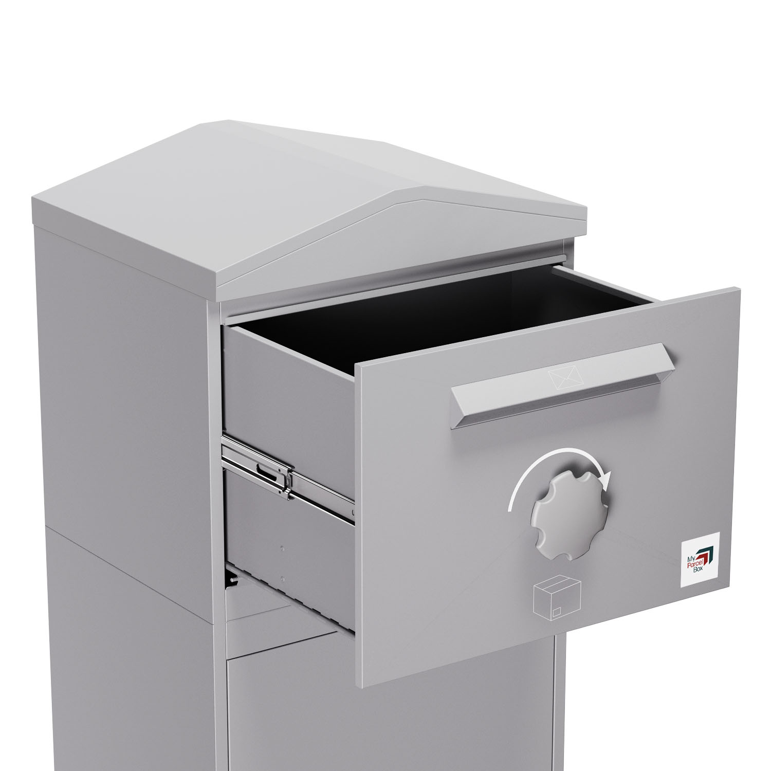 Sichere Zustellung: Jeder Kurier kann die Paketbox nutzen – ganz ohne Codes oder spezielle Zugänge. Pakete werden zuverlässig geschützt, bis die Box voll ist. Das Patent für diese Lieferboxen basiert auf der Schublade mit einem falschen Boden. Um die Schublade zu öffnen, muss der falsche Boden in die horizontale Position angehoben werden, damit die Schublade herausgezogen werden kann. Das Paket wird in die Schublade gelegt, und wenn die Schublade geschlossen wird, übernimmt die Schwerkraft, und der falsche Boden öffnet sich automatisch, um Pakete in das gesicherte Fach durchzulassen.