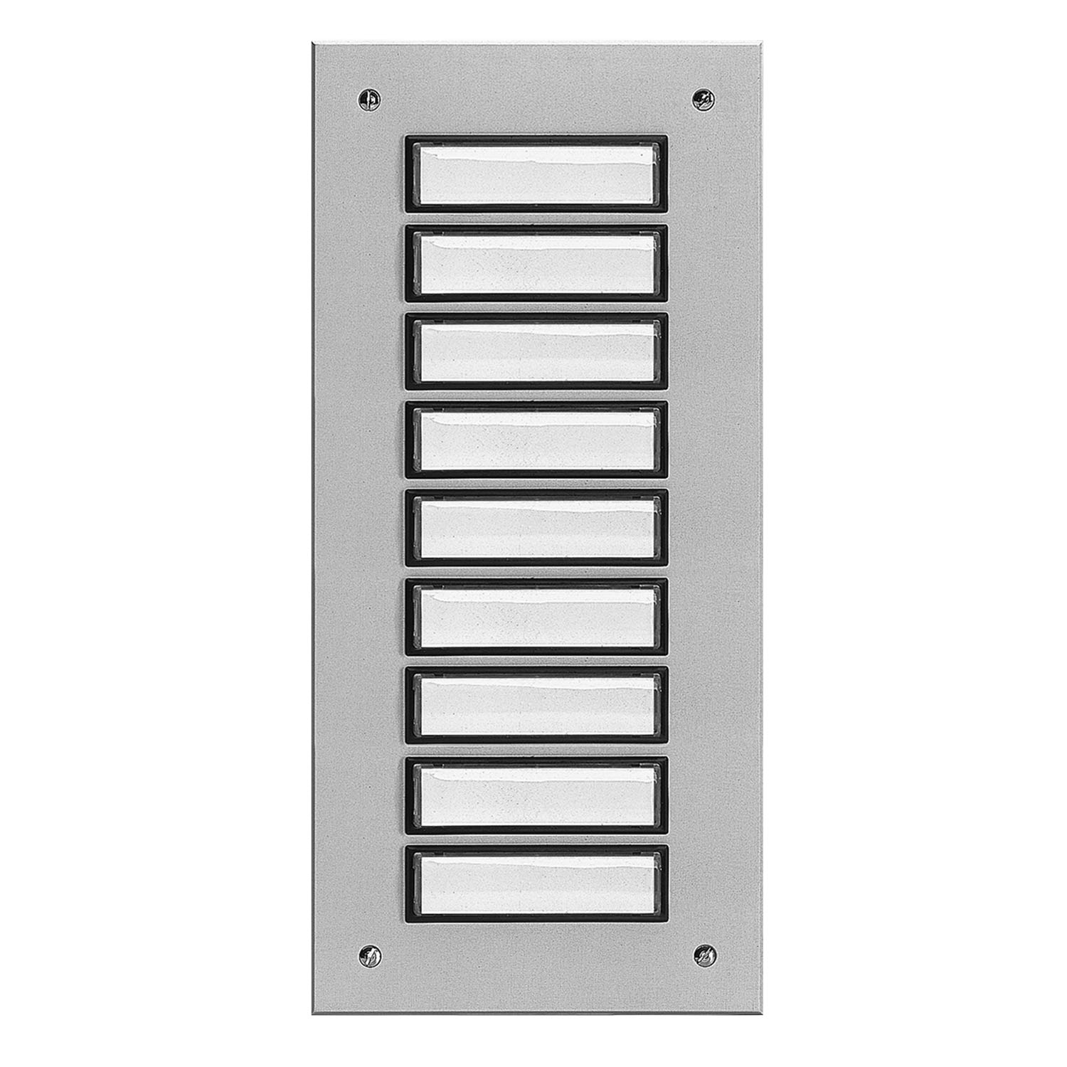 Die Etagenplatte 809 EV1 ist die ideale Lösung für große Mehrfamilienhäuser mit bis zu neun Wohneinheiten. Ihr Gehäuse aus silber eloxiertem Aluminium bietet nicht nur ein modernes Erscheinungsbild, sondern schützt zuverlässig vor Witterung und Korrosion – perfekt geeignet für den langfristigen Einsatz im Außenbereich.