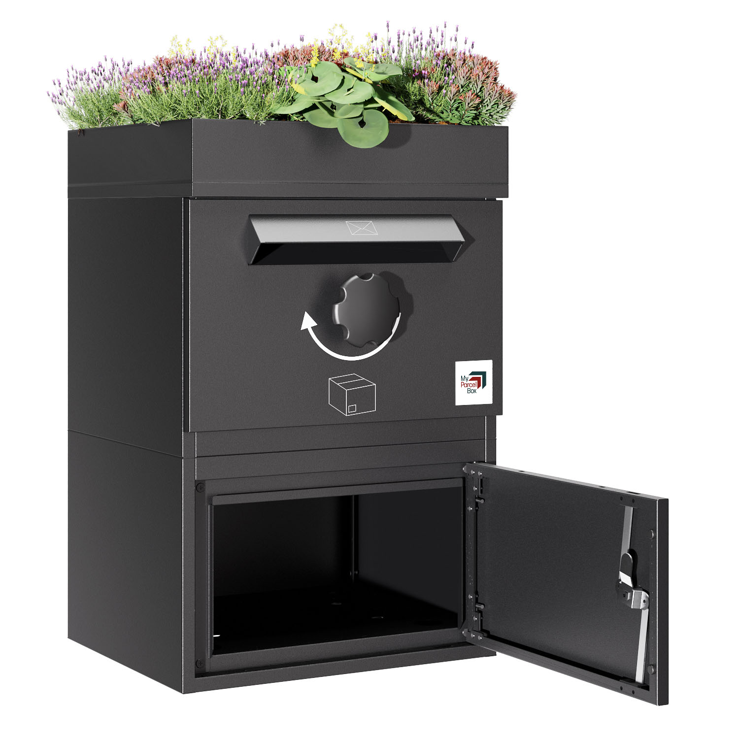 Pflanzdach-Design: Eine ausgezeichnete Wahl für Hobbygärtner oder alle, die möchten, dass sich ihre Paketbox unauffällig in den Garten einfügt. Das Dach kann individuell bepflanzt werden und macht die Box zu einem dekorativen Blickfang.