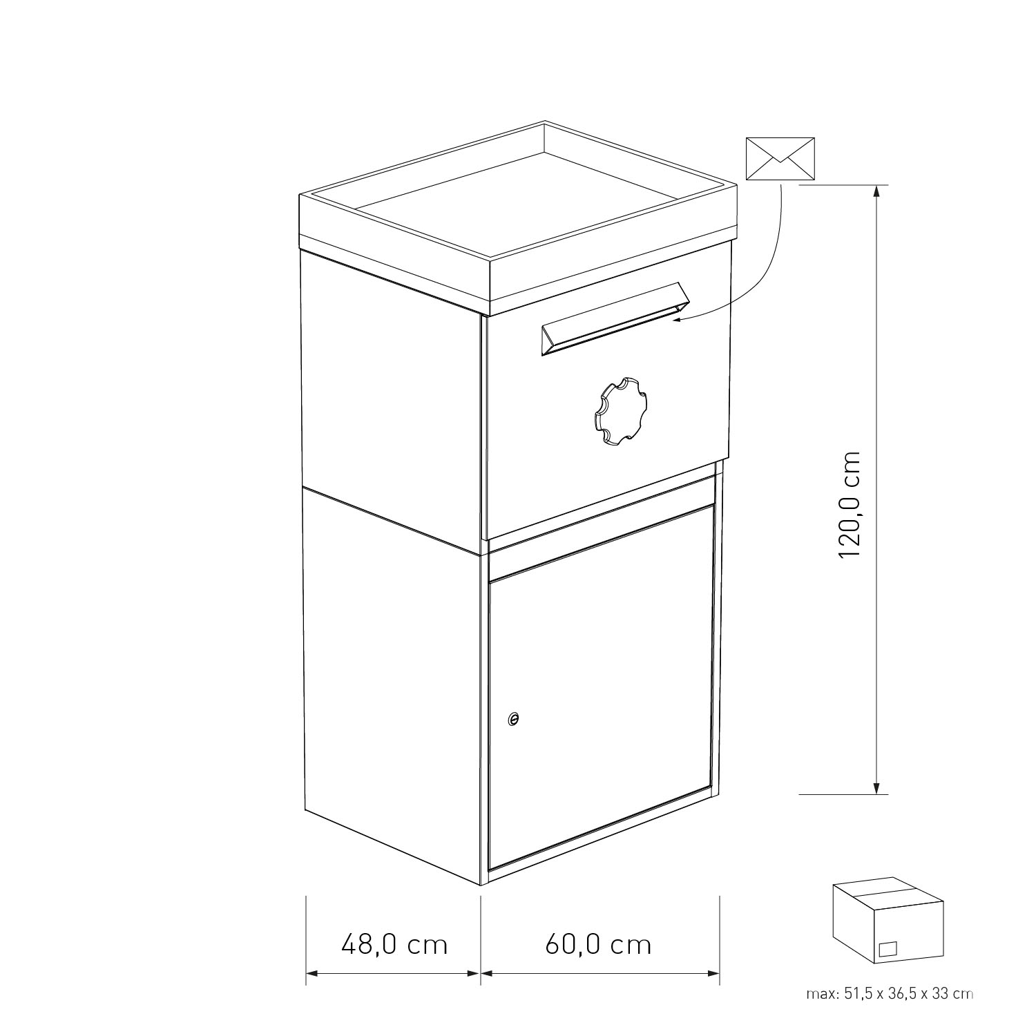 Extra große Paketbox XL: Nimmt problemlos Pakete bis zu einer Größe von 51,5 cm x 36,5 cm x 33 cm auf – ideal für mehrere Lieferungen pro Tag.