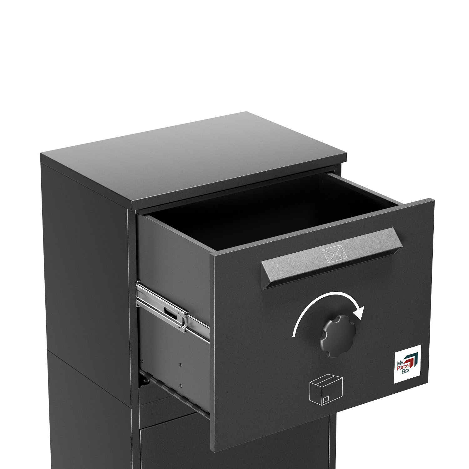 Sichere Zustellung: Jeder Kurier kann die Paketbox nutzen – ganz ohne Codes oder spezielle Zugänge. Pakete werden zuverlässig geschützt, bis die Box entleert wird. Das Patent für diese Lieferboxen basiert auf der Schublade mit einem falschen Boden. Um die Schublade zu öffnen, muss der falsche Boden in die horizontale Position angehoben werden, damit die Schublade herausgezogen werden kann. Das Paket wird in die Schublade gelegt, und wenn die Schublade geschlossen wird, übernimmt die Schwerkraft, und der falsche Boden öffnet sich automatisch, um Pakete in das gesicherte Fach durchzulassen.