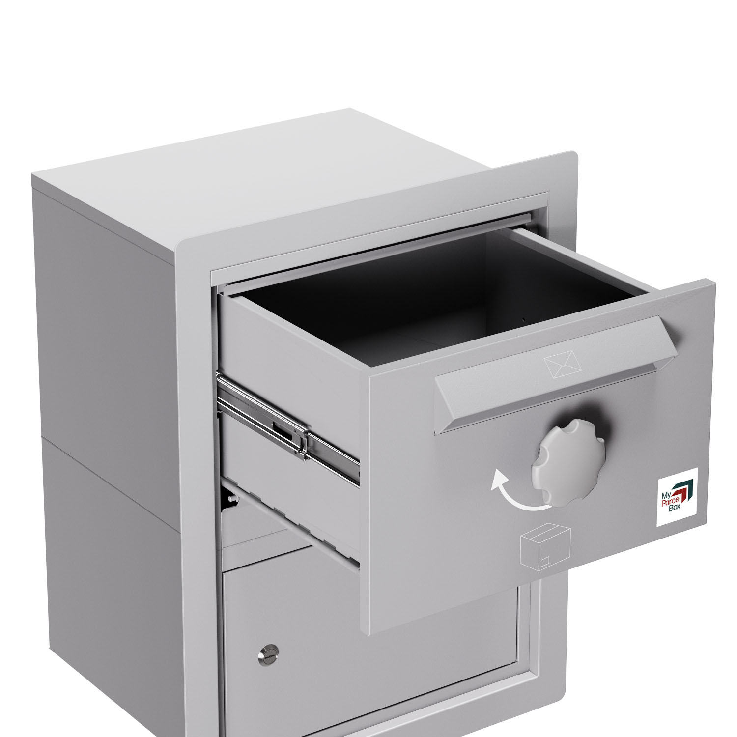 Sichere Zustellung: Jeder Kurier kann die Paketbox nutzen – ohne Codes oder spezielle Zugänge. Pakete werden zuverlässig geschützt, bis die Box entleert wird. Das patentierte System basiert auf der Schublade mit einem falschen Boden. Um die Schublade zu öffnen, wird der falsche Boden horizontal angehoben, die Schublade herausgezogen und das Paket eingelegt. Beim Schließen sorgt die Schwerkraft dafür, dass der falsche Boden automatisch öffnet und das Paket ins gesicherte Fach gelangt.