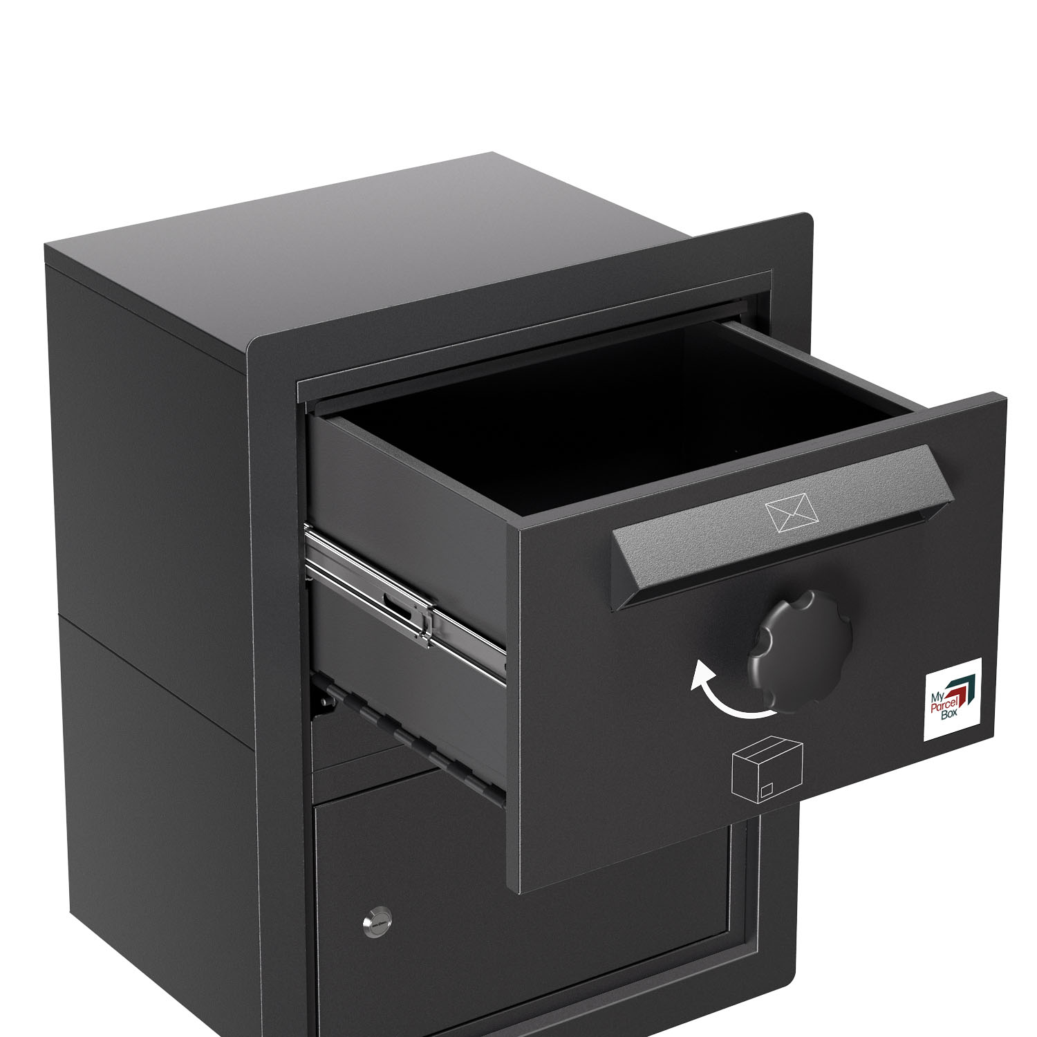 Sichere Zustellung: Jeder Kurier kann die Paketbox nutzen – ohne Codes oder spezielle Zugänge. Pakete werden zuverlässig geschützt, bis die Box entleert wird. Das patentierte System basiert auf der Schublade mit einem falschen Boden. Um die Schublade zu öffnen, wird der falsche Boden horizontal angehoben, die Schublade herausgezogen und das Paket eingelegt. Beim Schließen sorgt die Schwerkraft dafür, dass der falsche Boden automatisch öffnet und das Paket ins gesicherte Fach gelangt.